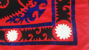 This red base vintage Suzani was hand-embroidered and hand-sewn in Bukhara, Uzbekistan in 1950-60s.
